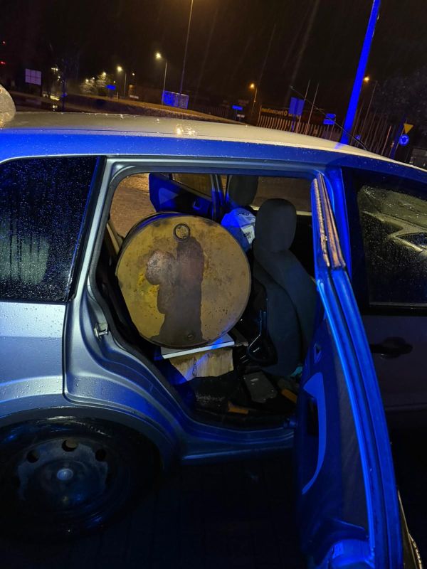 Dalsza kontrola ujawniła, że na samochodzie założone były tablice rejestracyjne przypisane do innego pojazdu, pochodzące z kradzieży. W pojeździe znajdowała się także beczka z substancją o zapachu oleju napędowego.